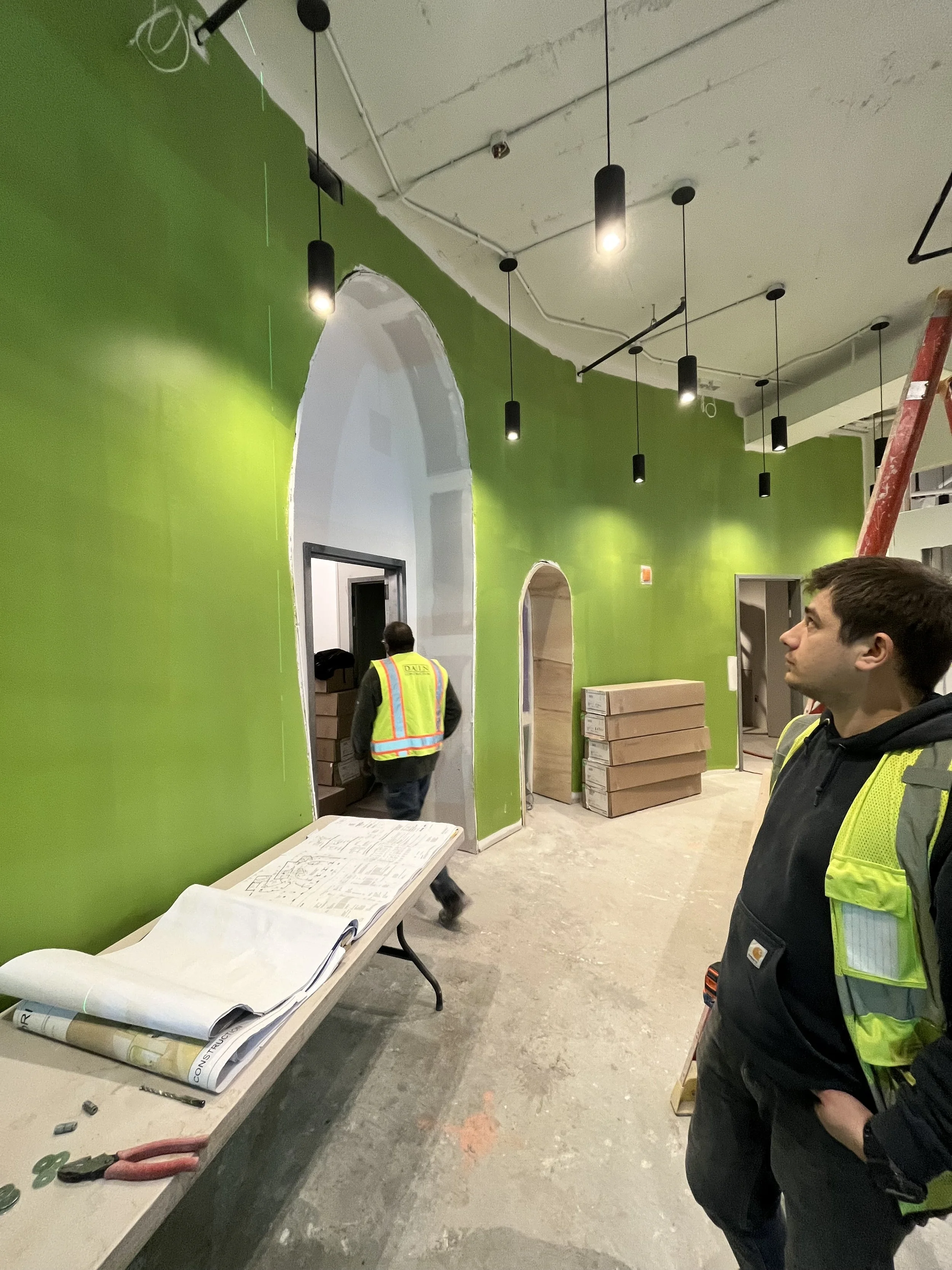 The detailing of the wall was developed as sandwiched glass panels between gypsum boards that were cut to the shape of the curves. The cutouts are then edged with a 2in white oak trim.