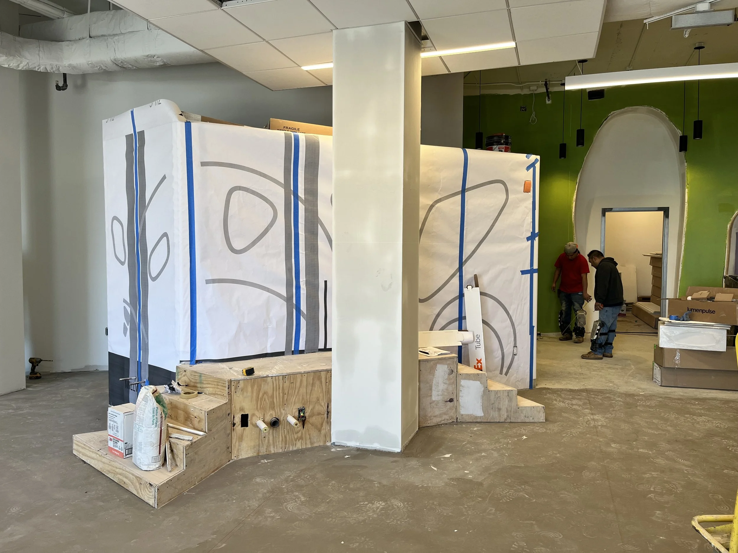 The existing curved wall of the current space is extended into a gentle ‘s’ into the new space to develop the new space configuration. This wall becomes the backdrop of the space, with openings into the support spaces and the play room.